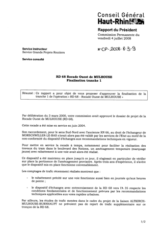Ce rapport a pour objet de vous proposer d'approuver la finalisation de la tranche 1 de l’opération « RD 68 - Rocade Ouest de MULHOUSE »