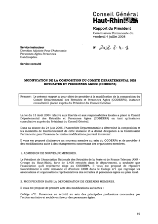 Le présent rapport a pour objet de procéder à la modification de la composition du Comité Départemental des Retraités et Personnes Agées (CODERPA), instance consultative placée auprès du Président du Conseil Général.