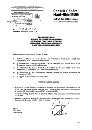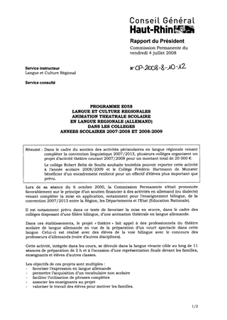 Dans le cadre du soutien des activités périscolaires en langue régionale venant compléter la convention linguistique 2007/2013, plusieurs collèges organisent un projet d’activité théâtre courant 2007/2008 pour un montant total de 20 000 €. Le collège Robert Beltz de Soultz souhaite toutefois pouvoir reporter cette activité à l’année scolaire 2008/2009 et le Collège Frédéric Hartmann de Munster bénéficier d’un encadrement renforcé pour un effectif d’élèves plus important que prévu.