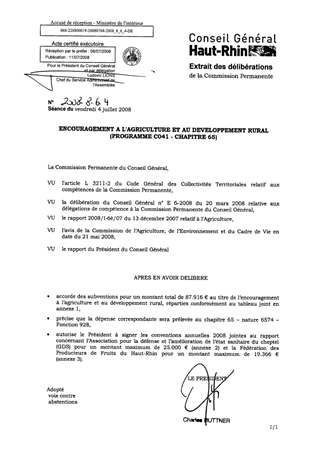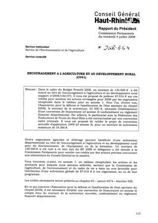 Dans le cadre du Budget Primitif 2008, un montant de 130.000 € a été inscrit au titre de l’encouragement à l’agriculture et au développement rural (rapport n°2008/I-6è/07). Il vous est proposé de prélever 87.916 € sur ces crédits pour soutenir les actions envisagées pour 2008 par les organismes récapitulés dans le tableau joint en annexe 1. Pour l’un d’entre eux, l’Association pour la défense et l’amélioration de l’état sanitaire du cheptel (GDS), le montant de la subvention, 25 000 €, nécessite l’établissement d’une convention de financement (cf annexe 2) conformément au règlement financier départemental. Par ailleurs, le partenariat avec la Fédération des Producteurs de Fruits du Haut-Rhin a été contractualisé par une convention cadre triennale. Il vous est proposé de valider le projet de convention annuelle d’application 2008 (cf annexe 3), pour un montant de subvention maximum de 19.366 €.