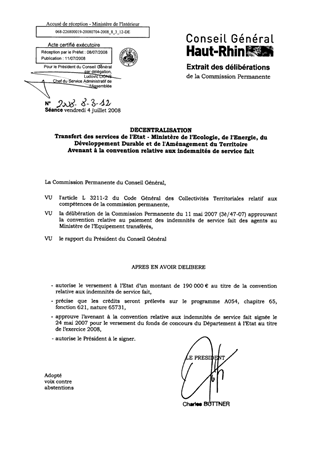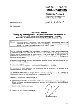 Décentralisation. Transfert des services de l'Etat - Ministère de l'écologie, de l'énergie, du développement durable et de l'aménagement du territoire - Avenant à la convention relative aux indemnités de service fait