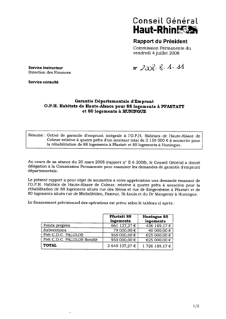 Octroi de garantie d'emprunt intégrale à l'O.P.H. Habitats de Haute-Alsace de Colmar relative à quatre prêts d’un montant total de 3 150 000 € à souscrire pour la réhabilitation de 88 logements à Pfastatt et 80 logements à Huningue.