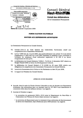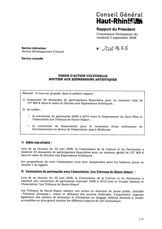 Il vous est proposé, dans le présent rapport : 1) d'examiner 20 demandes de participations financières pour un montant total de 157 800 € dans le cadre du Soutien aux Expressions Artistiques ; 2) de valider :  la convention de partenariat 2008 à 2010 entre le Département du Haut-Rhin et l'Association Les Tréteaux de Haute-Alsace ;  la convention de financement pour le versement d'une subvention de fonctionnement en faveur de l'Association Jazz à Mulhouse.