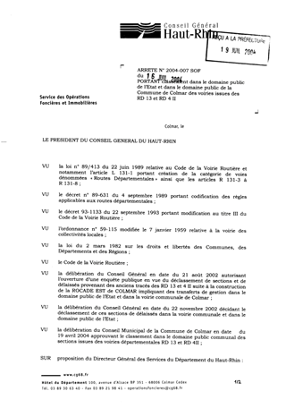 Portant classement dans le domaine public de l'Etat et dans le domaine public de la Commune de Colmar des voiries issues des RD 13 et RD 4 II Resumé Pièces jointes ARRETE Assemblée : Non défini Date : 16/07/2004 Rapporteur : Non défini Collectivité : Conseil départemental du Haut-Rhin Direction : Non défini Service : Service du Patrimoine et du droit des Sols Domaine : Déclassement de voirie Commission :
