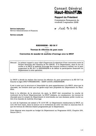 Le présent rapport a pour objet d’approuver la signature d’une convention entre la Société Nationale des Chemins de Fer (SNCF) et le Département, dans le but de confier à la SNCF la maîtrise d’ouvrage des travaux routiers à réaliser sur le pont supportant la RD 56 V à RIEDISHEIM et de définir la participation financière du Département à cette opération.