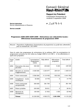 PROGRAMMES A082-A083-A084-A088 - SUBVENTIONS AUX COLLECTIVITES LOCALES - AFFECTATIONS D'AUTORISATIONS DE PROGRAMMES 2008
