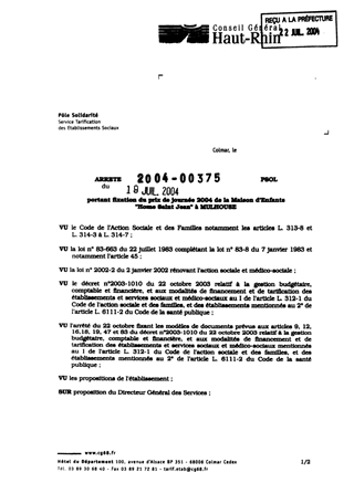 portant fixation du prix de journée 2004 de la maison d'enfants "Home Saint Jean" à MULHOUSE. Resumé Pièces jointes ARRETE Assemblée : Non défini Date : 19/07/2004 Rapporteur : Non défini Collectivité : Conseil départemental du Haut-Rhin Direction : Non défini Service : Service de la Tarification des Etablissements Domaine : Prix de Journée Commission :