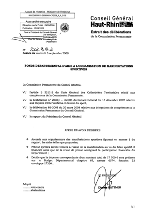 Le Fonds départemental d'aide à l'organisation de manifestations sportives se déroulant dans le Haut Rhin a été doté lors du B.P. 2008 de 170 000 €. Cette enveloppe est répartie au cas par cas, en cours d'année, par la Commission Permanente. Le présent rapport vous propose une 6ème série de dossiers à prendre en compte pour un montant de 17 700 €.