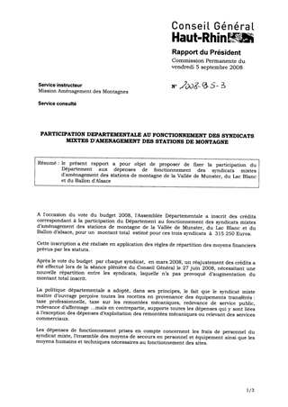 le présent rapport a pour objet de proposer de fixer la participation du Département aux dépenses de fonctionnement des syndicats mixtes d'aménagement des stations de montagne de la Vallée de Munster, du Lac Blanc et du Ballon d'Alsace