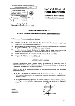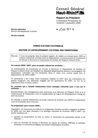 Il vous est proposé, dans le présent rapport, de valider un avenant pour 2008 au contrat culturel de territoire entre le Département, la Communauté de Communes de Cernay et Environs et l'Association de Gestion de l'Espace Culturel Grün.