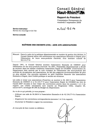 Dans le cadre de la politique départementale en matière de gestion des déchets, le Conseil Général alloue des subventions aux associations Emmaüs et Espoir pour l’élimination de leurs sous-produits d’activité, d’un montant cumulé de 98.414,77 €.