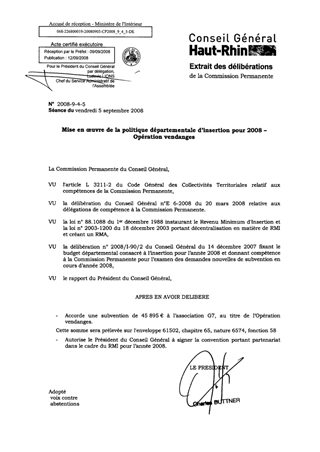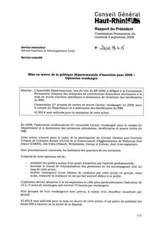 L’Assemblée Départementale, lors du vote du BP 2008, a délégué à la Commission Permanente l’examen des demandes de contributions financières nécessaires à la mise en œuvre d’actions spécifiques à destination de l’insertion des bénéficiaires du RMI. L’association G7 propose de mettre en œuvre l'action "vendanges" en 2008, pour le compte du Département et à destination des bénéficiaires du RMI. 45 895 € sont sollicités pour la réalisation de cette action.