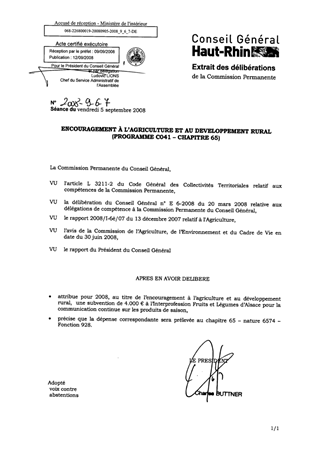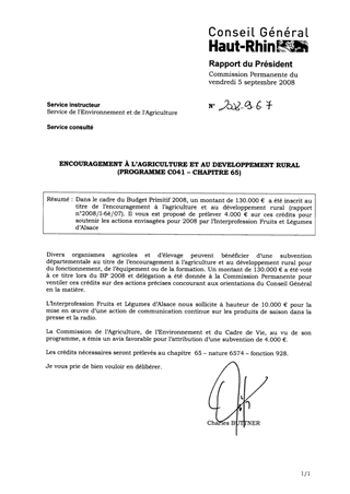 Dans le cadre du Budget Primitif 2008, un montant de 130.000 € a été inscrit au titre de l’encouragement à l’agriculture et au développement rural (rapport n°2008/I-6è/07). Il vous est proposé de prélever 4.000 € sur ces crédits pour soutenir les actions envisagées pour 2008 par l’Interprofession Fruits et Légumes d’Alsace