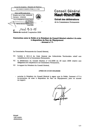 CONVENTION ENTRE LE PREFET ET LE PRESIDENT DU CONSEIL GEBERAL RELATIVE A LA MISE A DISPOSITION DU PARC DE L'EQUIPEMENT - AVENANT N°9