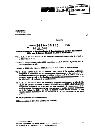 portant fixation de la dotation globale de fonctionnement au titre de l'exercice 2004 pour le service d'accueil de jour de Hirsingue. Resumé Pièces jointes ARRETE Assemblée : Non défini Date : 30/07/2004 Rapporteur : Non défini Collectivité : Conseil départemental du Haut-Rhin Direction : Non défini Service : Service de la Tarification des Etablissements Domaine : Prix de Journée Commission :