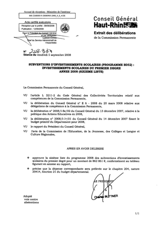 SUBVENTIONS D’INVESTISSEMENTS SCOLAIRES (PROGRAMME E052) : INVESTISSEMENTS SCOLAIRES DU PREMIER DEGRE ANNEE 2008 (SIXIEME LISTE)