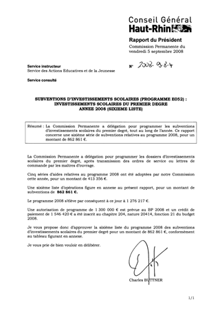 La Commission Permanente a délégation pour programmer les subventions d’investissements scolaires du premier degré, tout au long de l’année. Ce rapport concerne une sixième série de subventions relatives au programme 2008, pour un montant de 862 861 €.