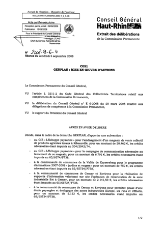 Dans le cadre de la démarche GERPLAN, le groupement d’intérêt économique « L’Echoppe Paysanne », les communautés de communes de la Vallée de Kaysersberg et de Cernay et Environs, l’association « Patrimoine paysan de montagne » sollicitent le Département pour la mise en œuvre d’actions : création et promotion d’un point de vente collectif de produits fermiers à Ribeauvillé, animations sur le thème du jardin et des vergers à destination de la population locale à Kaysersberg, communication et étude paysagère et écologique pour la renaturation des zones industrielles à Cernay et Uffholtz, organisation et promotion d’une fête paysanne au col des Bagenelles. Il vous est proposé de financer leurs demandes, détaillées dans le présent rapport, pour un montant total de 33.724,50 €.