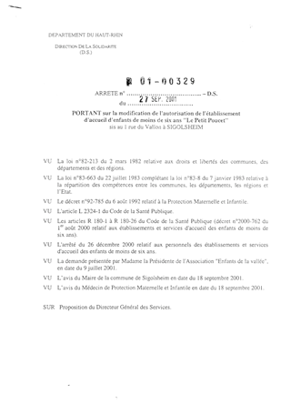Portant sur la modification de l'autorisation de l'établissement d'accueil d'enfants de moins de six ans Le Petit Poucet sis au 1 rue du Vallon à Sigolsheim Resumé Pièces jointes ARRETE Assemblée : Non défini Date : 27/09/2001 Rapporteur : Non défini Collectivité : Conseil départemental du Haut-Rhin Direction : Non défini Service : Service de Protection Maternelle et Infantile Domaine : Accueil d'enfants Commission :