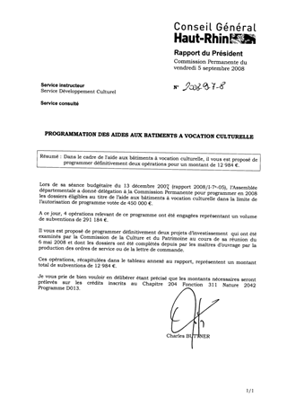 Dans le cadre de l'aide aux bâtiments à vocation culturelle, il vous est proposé de programmer définitivement deux opérations pour un montant de 12 984 €.
