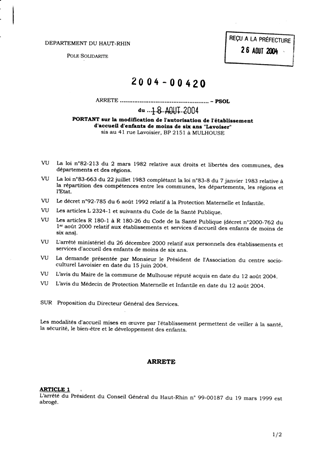 portant sur la modification de l'autorisation de l'établissement d'accueil d'enfants de moins de six ans "Lavoiser" sis au 41 rue Lavoisier BP 2151 à MULHOUSE. Resumé Pièces jointes ARRETE Assemblée : Non défini Date : 18/08/2004 Rapporteur : Non défini Collectivité : Conseil départemental du Haut-Rhin Direction : Non défini Service : Direction de la Solidarité Domaine : Accueil d'enfants Commission :