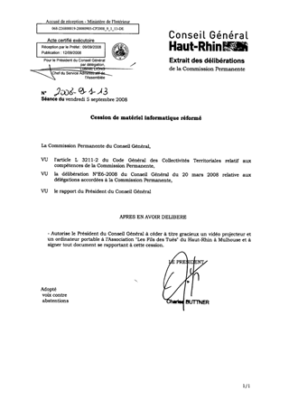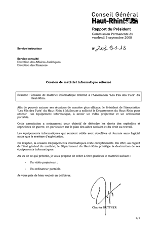 CESSION DE MATERIEL INFORMATIQUE REFORME Resumé Cession de matériel informatique réformé à l'Association "Les Fils des Tués" du Haut-Rhin. Pièces jointes DELIBERATION RAPPORT Assemblée : Commission Permanente Date : 05/09/2008 Rapporteur : Non défini Collectivité : Conseil départemental du Haut-Rhin Direction : Non défini Service : Direction des Ressources Humaines et Dialogue Social Domaine : Finances publiques Commission : Commission Permanente