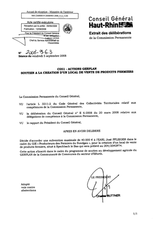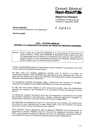 Dans le cadre de la démarche GERPLAN de la Communauté de Communes du secteur d’Illfurth, l’EARL José PFLIEGER de Spechbach-le-Bas sollicite une aide du Département pour la création et la promotion d’un point de vente collectif de produits fermiers. Il vous est proposé de financer cette demande, détaillée dans le présent rapport, pour un montant total de 40.000 €.