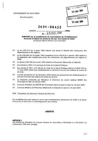 portant sur la modification de l'autorisation de l'établissement d'accueil d'enfants de moins de six ans "Les Lutins du Galtz" sis Square Marcel Rivière aux Trois-Epis. Resumé Pièces jointes ARRETE Assemblée : Non défini Date : 26/08/2004 Rapporteur : Non défini Collectivité : Conseil départemental du Haut-Rhin Direction : Non défini Service : Direction de la Solidarité Domaine : Accueil d'enfants Commission :