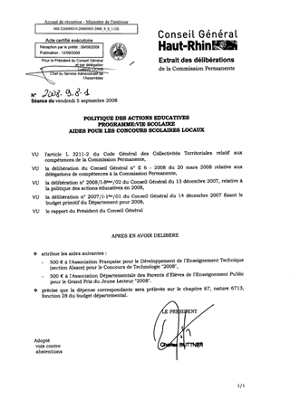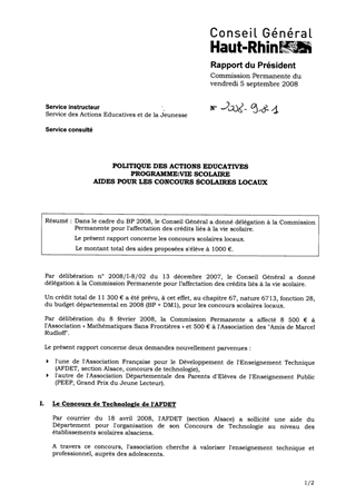 Dans le cadre du BP 2008, le Conseil Général a donné délégation à la Commission Permanente pour l'affectation des crédits liés à la vie scolaire. Le présent rapport concerne les concours scolaires locaux. Le montant total des aides proposées s'élève à 1000 €.