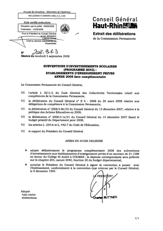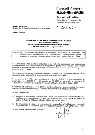 La Commission Permanente a délégation pour voter le programme des subventions d'investissement aux établissements d’enseignement privés. Le montant de cette liste complémentaire s'élève, pour l'année 2008, à 21 158 €.