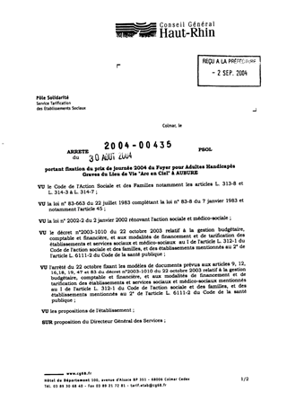 portant fixation du prix de journée 2004 du foyer pour adultes handicapés graves du lieu de vie "Arc en Ciel" à AUBURE. Resumé Pièces jointes ARRETE Assemblée : Non défini Date : 30/08/2004 Rapporteur : Non défini Collectivité : Conseil départemental du Haut-Rhin Direction : Non défini Service : Service de la Tarification des Etablissements Domaine : Prix de Journée Commission :
