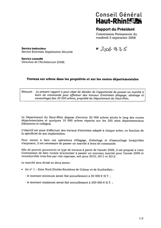 Le présent rapport a pour objet de décider de l’opportunité de passer un marché à bons de commande pour effectuer des travaux d’entretien (élagage, abattage et essouchage) des 30 000 arbres, propriété du Département du Haut-Rhin.