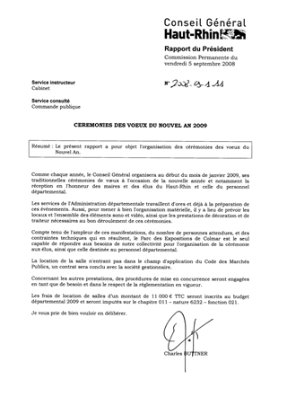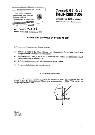 CEREMONIES DES VOEUX DU NOUVEL AN 2009 Resumé Le présent rapport a pour objet l'organisation des cérémonies des voeux du Nouvel An. Pièces jointes DELIBERATION RAPPORT Assemblée : Commission Permanente Date : 05/09/2008 Rapporteur : Non défini Collectivité : Conseil départemental du Haut-Rhin Direction : Non défini Service : Cabinet Domaine : Finances publiques Commission : Commission Permanente