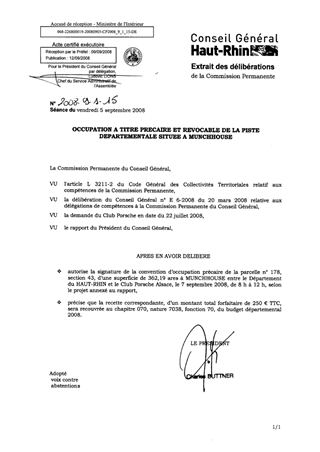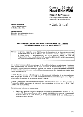 Le présent rapport a pour objet la mise à disposition de la piste départementale située entre la RD 47 et la RD 47 I, sur les anciens terrains militaires acquis par le Département à MUNCHHOUSE, au Club Porsche Alsace en vue de l’organisation d’une manifestation le 7 septembre 2008 de 8 h à 12 h, moyennant une redevance totale forfaitaire de 250 € TTC.
