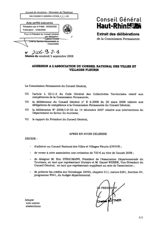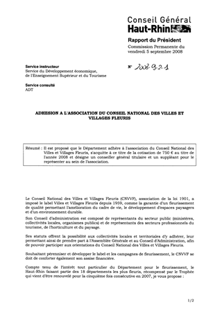 Il est proposé que le Département adhère à l'association du Conseil National des Villes et Villages Fleuris, s'acquitte à ce titre de la cotisation de 750 € au titre de l'année 2008 et désigne un conseiller général titulaire et un suppléant pour le représenter au sein de l’association.