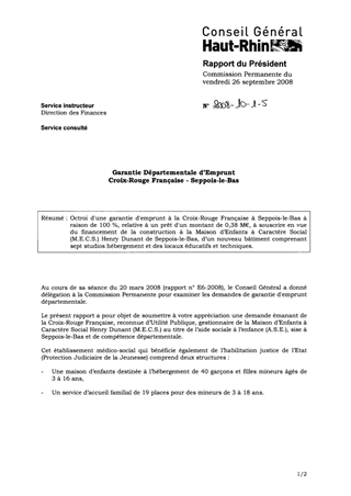 Octroi d'une garantie d'emprunt à la Croix-Rouge Française à Seppois-le-Bas à raison de 100 %, relative à un prêt d'un montant de 0,38 M€, à souscrire en vue du financement de la construction à la Maison d’Enfants à Caractère Social (M.E.C.S.) Henry Dunant de Seppois-le-Bas, d’un nouveau bâtiment comprenant sept studios hébergement et des locaux éducatifs et techniques.