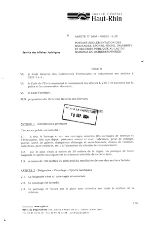 portant réglementation des baignades, sports, pêche Resumé Pièces jointes ARRETE Assemblée : Non défini Date : 09/09/2004 Rapporteur : Non défini Collectivité : Conseil départemental du Haut-Rhin Direction : Non défini Service : Service Juridique Domaine : Autres (non classés) Commission :