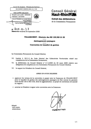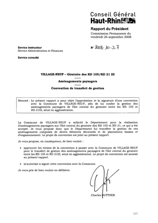Le présent rapport a pour objet l’approbation et la signature d’une convention avec la Commune de VILLAGE-NEUF, afin de lui confier la gestion des aménagements paysagers de l’îlot central du giratoire entre les RD 105 et RD 21III, situé en agglomération.