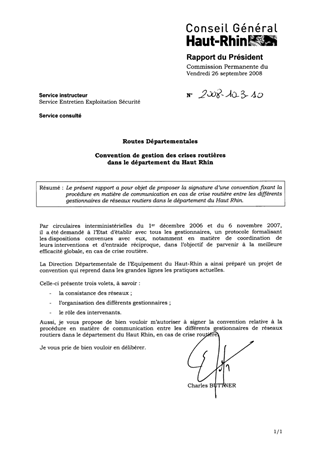 Le présent rapport a pour objet de proposer la signature d’une convention fixant la procédure en matière de communication en cas de crise routière entre les différents gestionnaires de réseaux routiers dans le département du Haut Rhin.