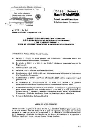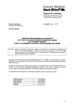 GARANTIE DEPARTEMENTALE D'EMPRUNT O.P.H. DE LA VALLEE DE SAINTE- MARIE-AUX-MINES - VAL D’ARGENT HABITAT- POUR 13 LOGEMENTS LOCATIFS A SAINTE-MARIE-AUX–MINES.