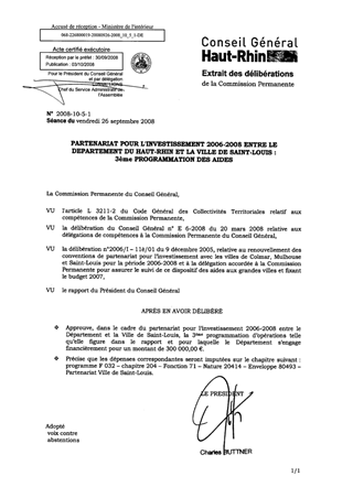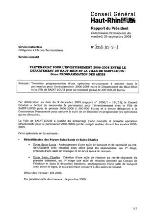 PARTENARIAT POUR L'INVESTISSEMENT 2006-2008 ENTRE LE DEPARTEMENT DU HAUT-RHIN ET LA VILLE DE SAINT-LOUIS : 3ème PROGRAMMATION DES AIDES