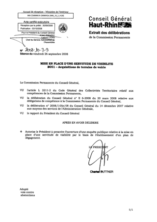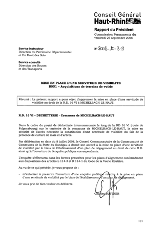 Le présent rapport a pour objet d'approuver la mise en place d’une servitude de visibilité au droit de la R.D. 16 VI à MICHELBACH-LE-HAUT.