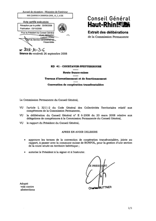 RD 41 - COURTAVON-PFETTERHOUSE ------ ROUTE FRANCO-SUISSE ------ TRAVAUX D'INVESTISSEMENT ET DE FONCTIONNEMENT ----- CONVENTION DE COOPERATION TRANSFRONTALIERE