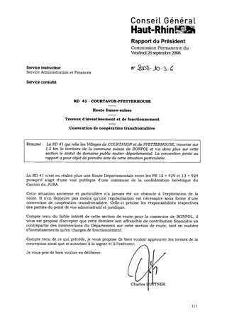 La RD 41 qui relie les Villages de COURTAVON et de PFETTERHOUSE, traverse sur 1,5 km le territoire de la commune suisse de BONFOL et n'a donc plus sur cette section le statut de domaine public routier départemental. La convention jointe au rapport a pour objet de prendre acte de cette situation particulière.
