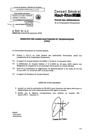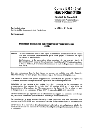 Les trois communes dont la liste figure en annexe au présent rapport ont sollicité une aide financière départementale pour leurs projets d’insertion de lignes électriques et téléphoniques. Conformément à la convention départementale de partenariat, signée le 20 décembre 2007 entre le Département du Haut-Rhin, EDF Distribution Alsace et France Télécom, le total des subventions de la part du Département s’élèverait à 58.425 €