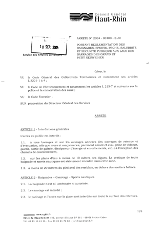 portant réglementation des baignades, sports, pêche, salubrité et sécurité publique aux lacs des barrages des Grand et Petit Neuweiher. Resumé Pièces jointes ARRETE Assemblée : Non défini Date : 09/09/2004 Rapporteur : Non défini Collectivité : Conseil départemental du Haut-Rhin Direction : Non défini Service : Service Juridique Domaine : Autres (non classés) Commission :