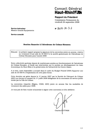 Le présent rapport propose la signature de la convention jointe en annexe, relative au versement d'une aide de 30 000 € à la société gestionnaire de l'Aérodrome de Colmar-Houssen pour l'année 2008