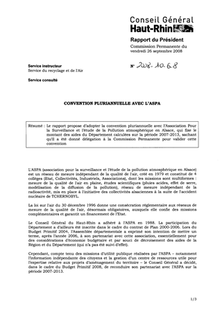 Le rapport propose d’adopter la convention pluriannuelle avec l’Association Pour la Surveillance et l’étude de la Pollution atmosphérique en Alsace, qui fixe le montant des aides du Département calculées sur la période 2007-2013, sachant qu’il a été donné délégation à la Commission Permanente pour valider cette convention