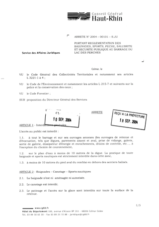 portant réglementation des baignades, sports, pêche, salubrité et sécurité publique au barrage du Lac des Perches. Resumé Pièces jointes ARRETE Assemblée : Non défini Date : 09/09/2004 Rapporteur : Non défini Collectivité : Conseil départemental du Haut-Rhin Direction : Non défini Service : Service Juridique Domaine : Autres (non classés) Commission :