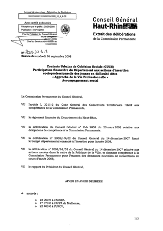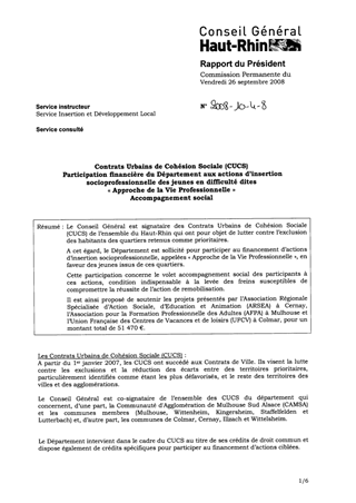 Le Conseil Général est signataire des Contrats Urbains de Cohésion Sociale (CUCS) de l’ensemble du Haut-Rhin qui ont pour objet de lutter contre l’exclusion des habitants des quartiers retenus comme prioritaires. A cet égard, le Département est sollicité pour participer au financement d’actions d’insertion socioprofessionnelle, appelées « Approche de la Vie Professionnelle », en faveur des jeunes issus de ces quartiers. Cette participation concerne le volet accompagnement social des participants à ces actions, condition indispensable à la levée des freins susceptibles de compromettre la réussite de l’action de remobilisation. Il est ainsi proposé de soutenir les projets présentés par l’Association Régionale Spécialisée d’Action Sociale, d’Education et Animation (ARSEA) à Cernay, l’Association pour la Formation Professionnelle des Adultes (AFPA) à Mulhouse et l’Union Française des Centres de Vacances et de loisirs (UFCV) à Colmar, pour un montant total de 51 470 €.